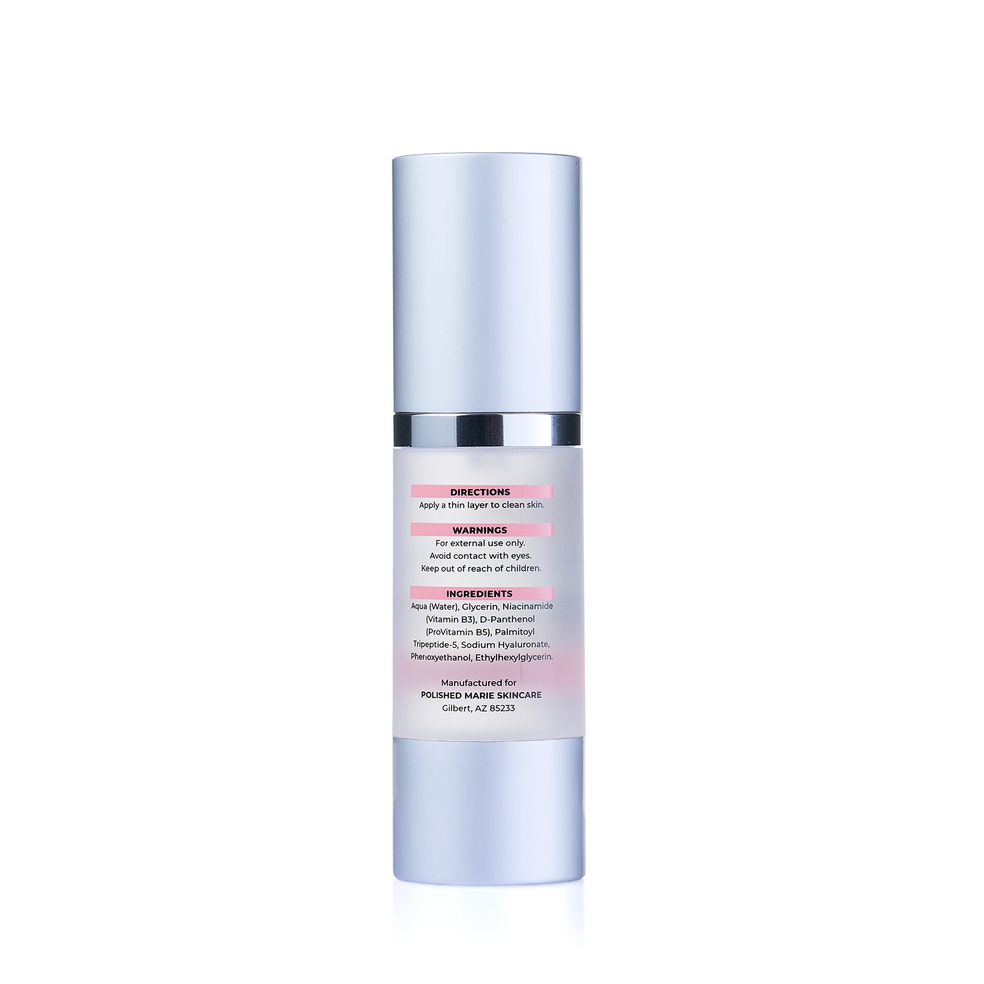 Polished Marie Skincare’s Hyaluronic acid with peptides serum is a lightweight formula designed for all skin types. Featuring Hyaluronic Acid, Tripeptide-5, Niacinamide and Panthenol. This fragrance-free and vegan serum helps skin feel more hydrated and appear firmer without clogging. Perfect for daily use, as well as under makeup or sunscreen.
